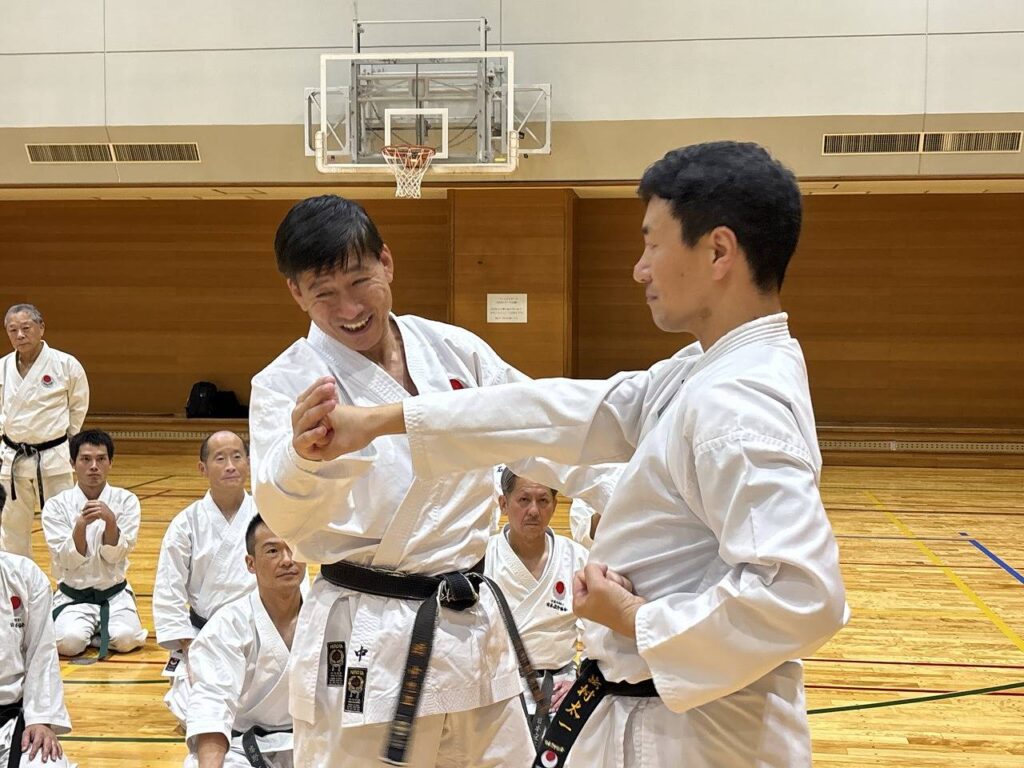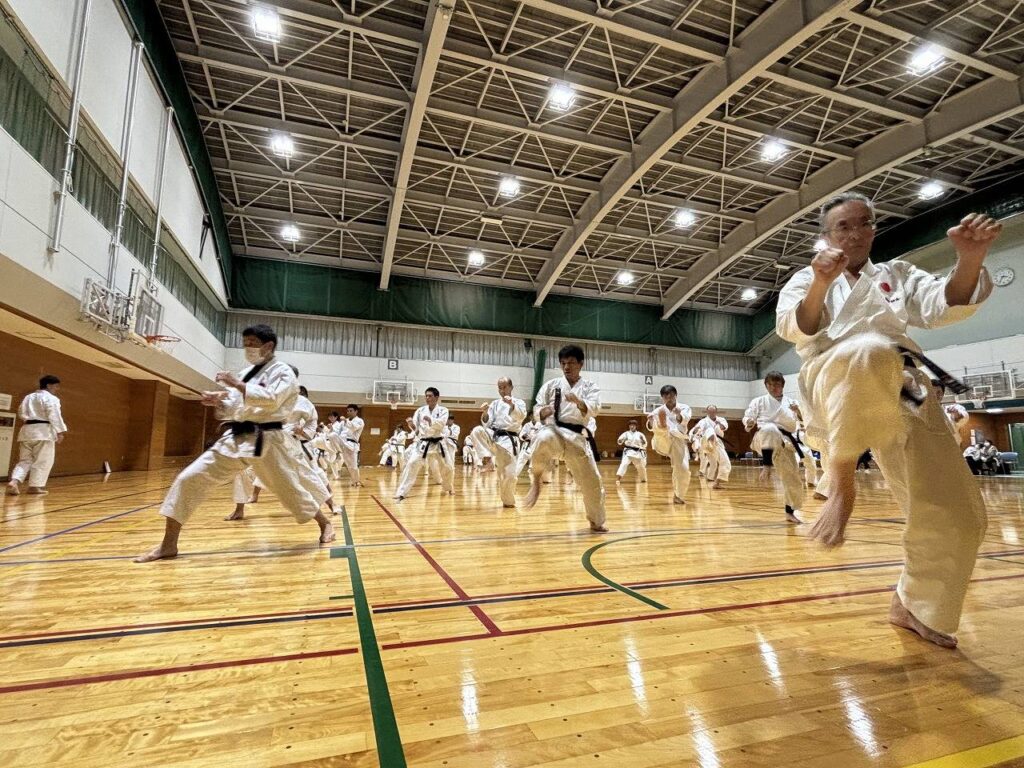 続いて15時からは、47名の高校生・一般が結集。テーマは「形で学ぶ(慈恩)」。ここからが「中ワールド」の真骨頂でした。「では、実験してみましょう」。師範の言葉とともに、道場は巨大な実験室へ。礼三息や立ち方一つで力が劇的に変わる不思議体験に、参加者の頭上には「?」マークが点滅しっぱなし。幸運にも実験台となった参加者の突きが、アドバイス1つで強くなったり弱くなったり。会場からは「なんで?」という苦笑いと「すごい…」というため息が交錯しました。形とは単なる動作ではなく、武道の神髄が詰まったカプセルなのだと思い知らされた2時間でした。