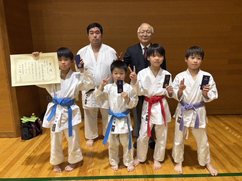 低学年団体組手の部に出場しました。茶帯、紫帯、白帯の選手でしたが、よく頑張って3位に入賞しました。特に3年生の茶帯の選手は、一度も負けずに勝ち抜き、紫帯、白帯の選手もどちらかが何とか勝っての結果でした。